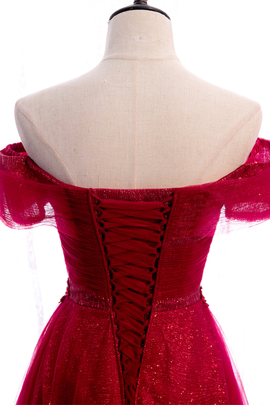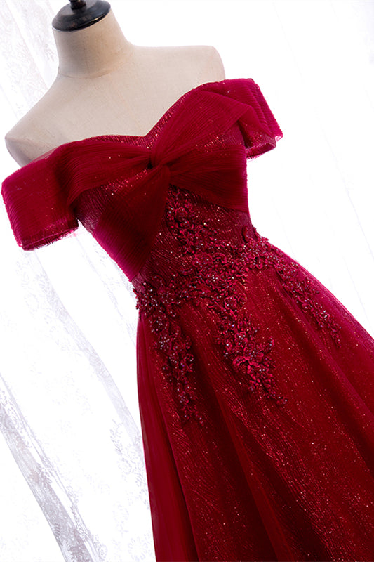 Red A-line Off-the-Shoulder Twist Knot Beaded Appliques Maxi Formal Dress