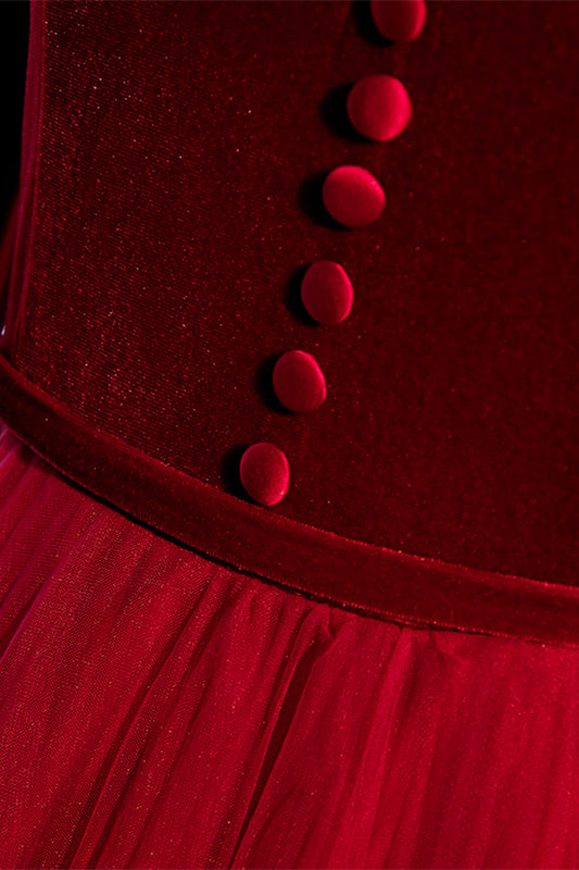 Red A-line Puff Long Sleeves Lace-Up Maxi Formal Dress with Buttons