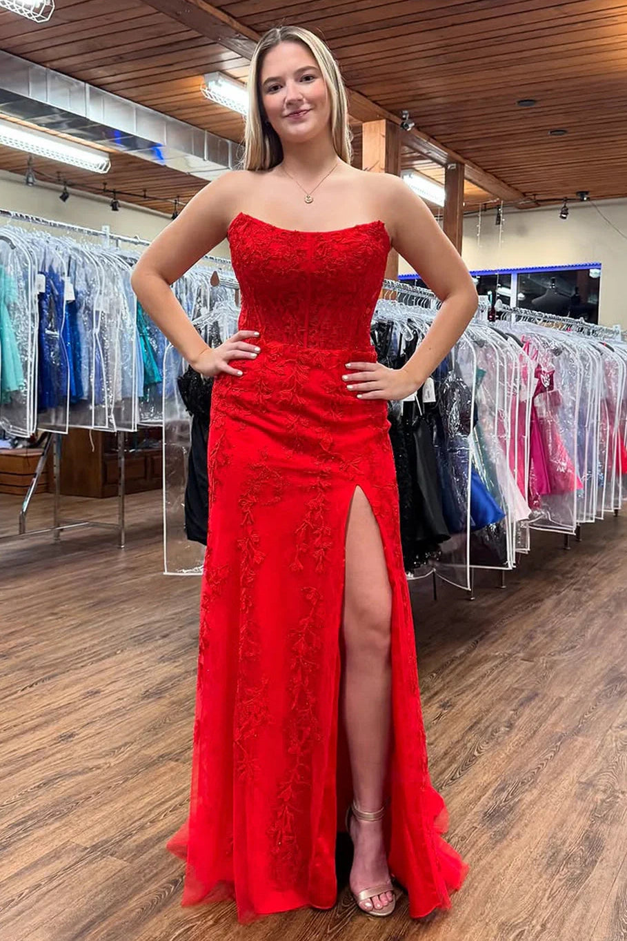 Red Bateau Strapless Empire Lace Appliques Party Prom Dress With Slit
