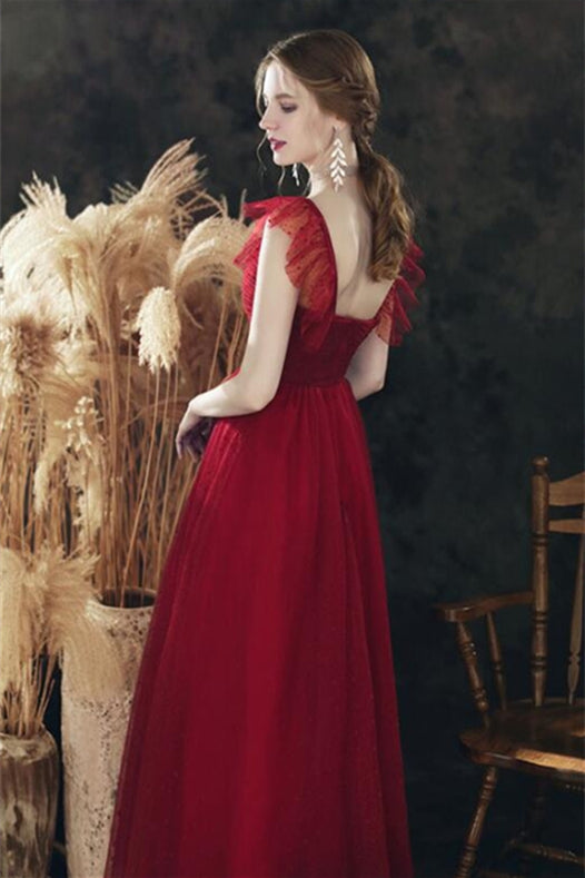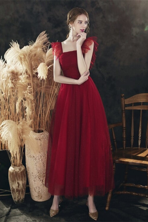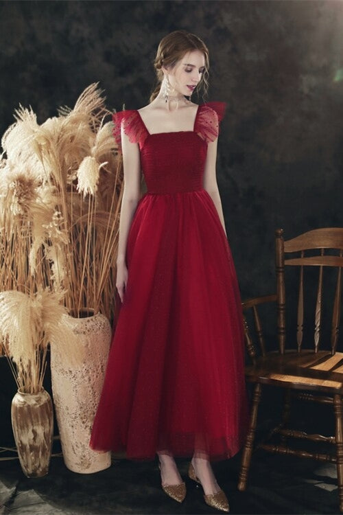 Joyofdress this A-line silhouette dress features a corset bodice with flutter sleeves and a tea-length skirt.