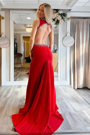Red Low V-Neck Backless Beaded Party Prom Dress