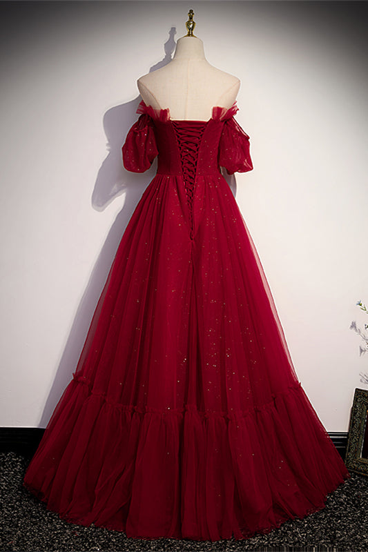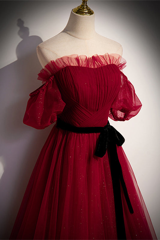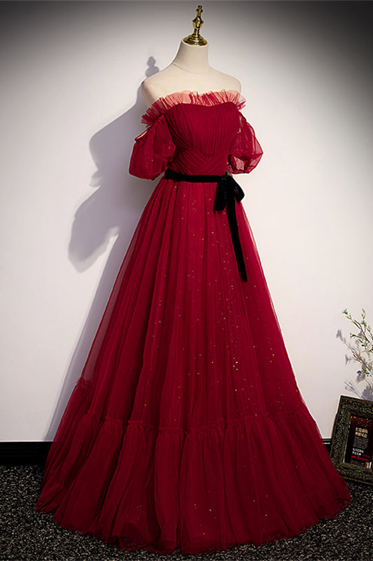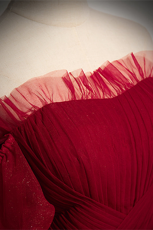 Red Off-the-Shoulder Pleated Ruffle Maxi Formal Dress with Sash