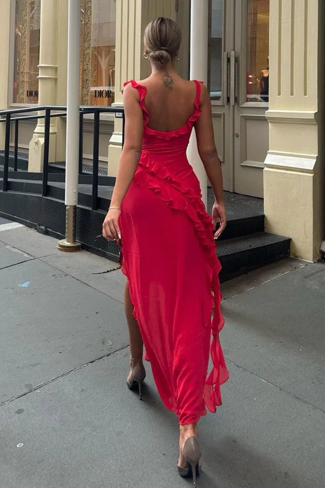 Red Square Sleeveless Ruffled Long Party Prom Dress
