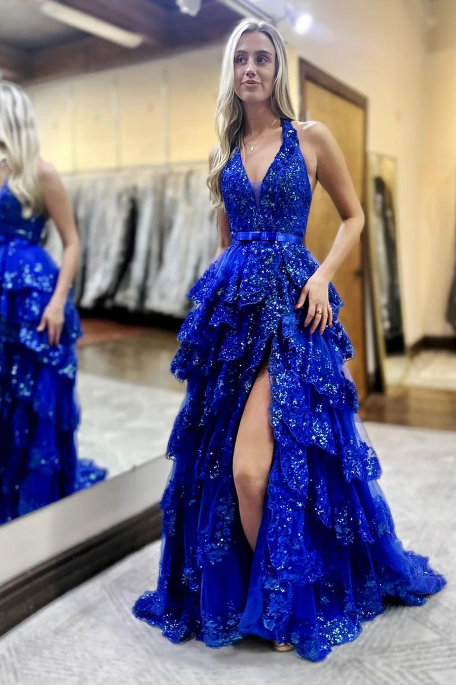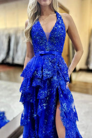 Royal Blue V-Neck Halter Backless Tiered Lace Prom Dress
