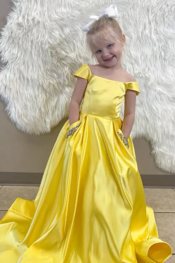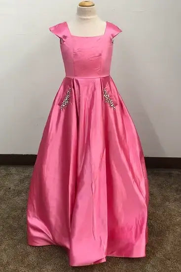 This satin A-line dress is designed for girls participating in pageants. With its sleeveless design and convenient pockets, it offers both comfort and practicality. The luxurious satin material adds a touch of elegance, making it the perfect choice for any pageant event.