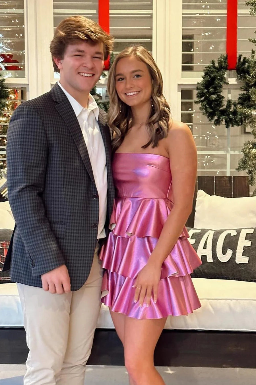 Expertly crafted from luxurious pink satin, this A-line strapless dress is perfect for any party or homecoming event. The tiered design adds a touch of elegance to the short length, making you stand out from the crowd. You'll feel confident and stylish in this stunning dress, guaranteed.