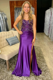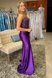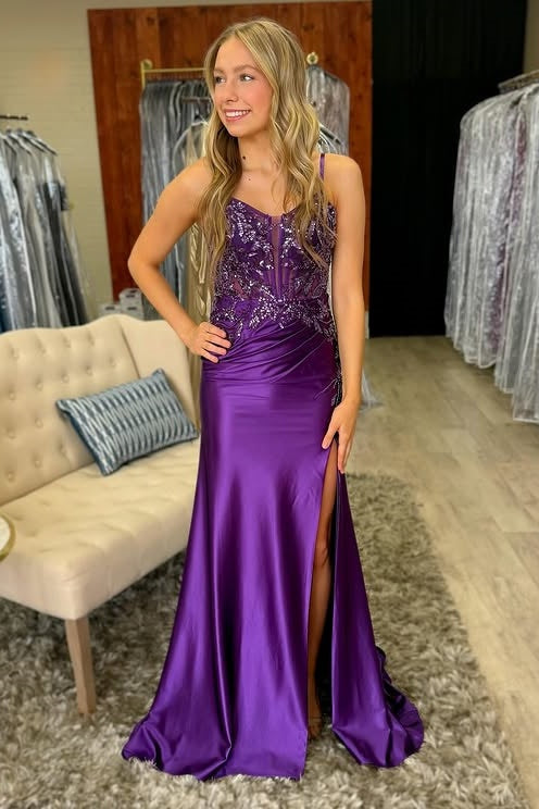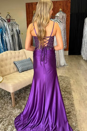 Satin Mermaid V-Neck Sleeveless Appliques Party Prom Dress