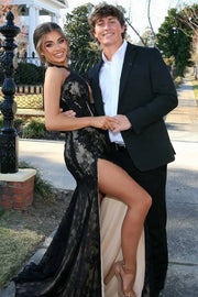 Sexy Halter Sleeveless Mermaid Lace Party Prom Dress With Slit