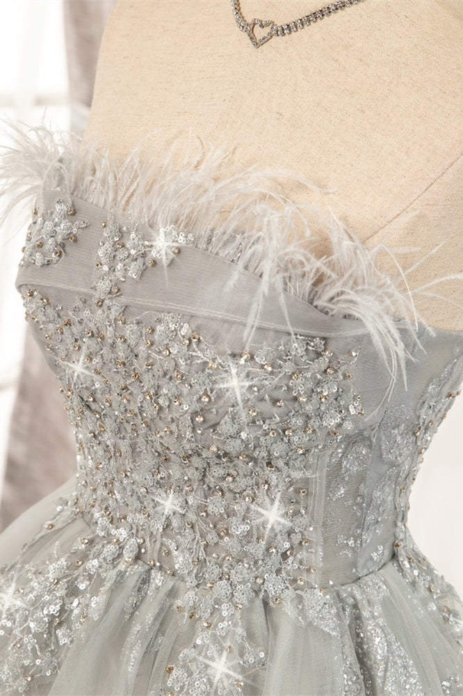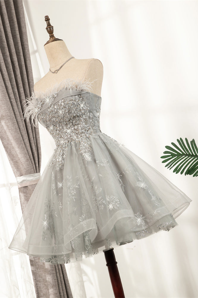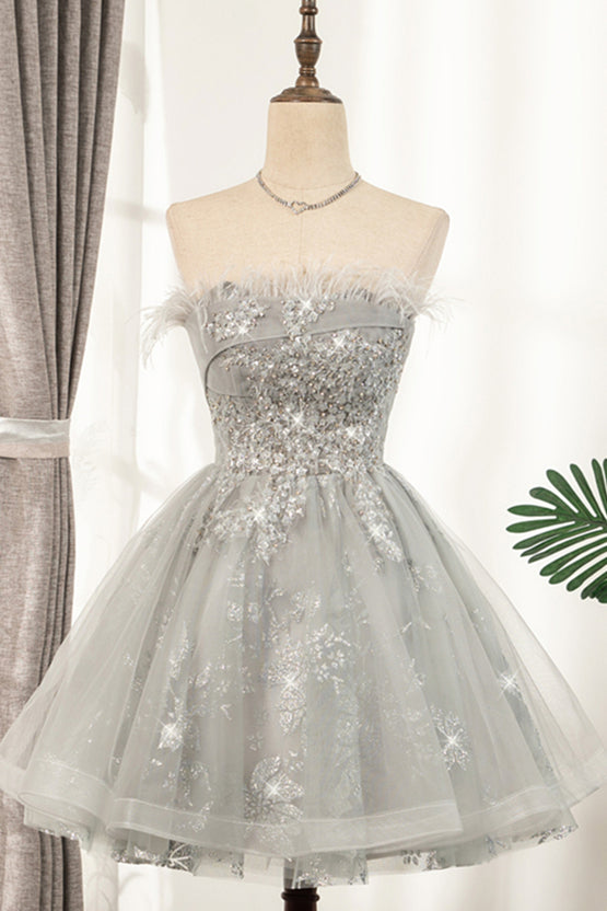 Silver Strapless Feathers Beaded Tulle Homecoming Dress