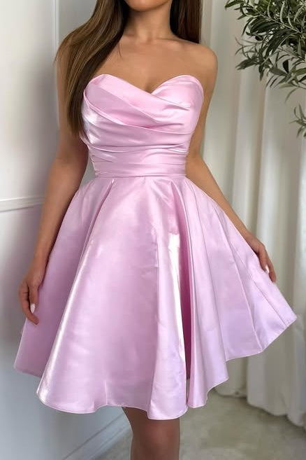 Simple Satin A-Line Sweetheart Pleated Strapless Homecoming Dress