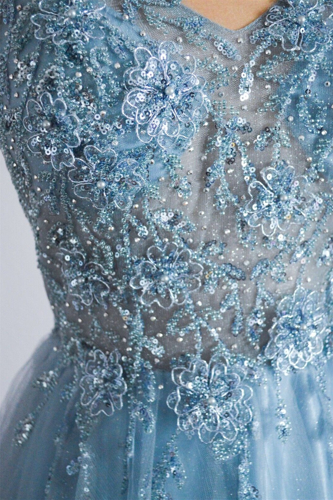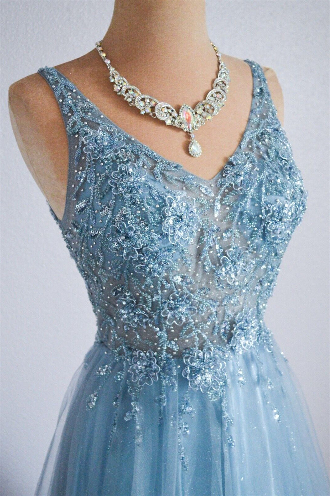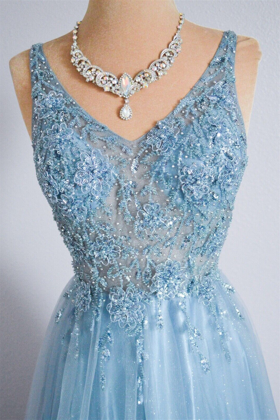 Elevate your formal occasion with this sophisticated tulle A-line gown. The delicate lace appliqués adorning the bodice create an elegant focal point, while the flattering V-neckline offers refined femininity. Constructed from premium tulle, the voluminous skirt provides graceful movement and dimension. The floor-length silhouette ensures timeless appeal for proms, galas, and black-tie events. This dress combines classic design elements with contemporary styling, delivering a polished look that commands attention while maintaining understated elegance.