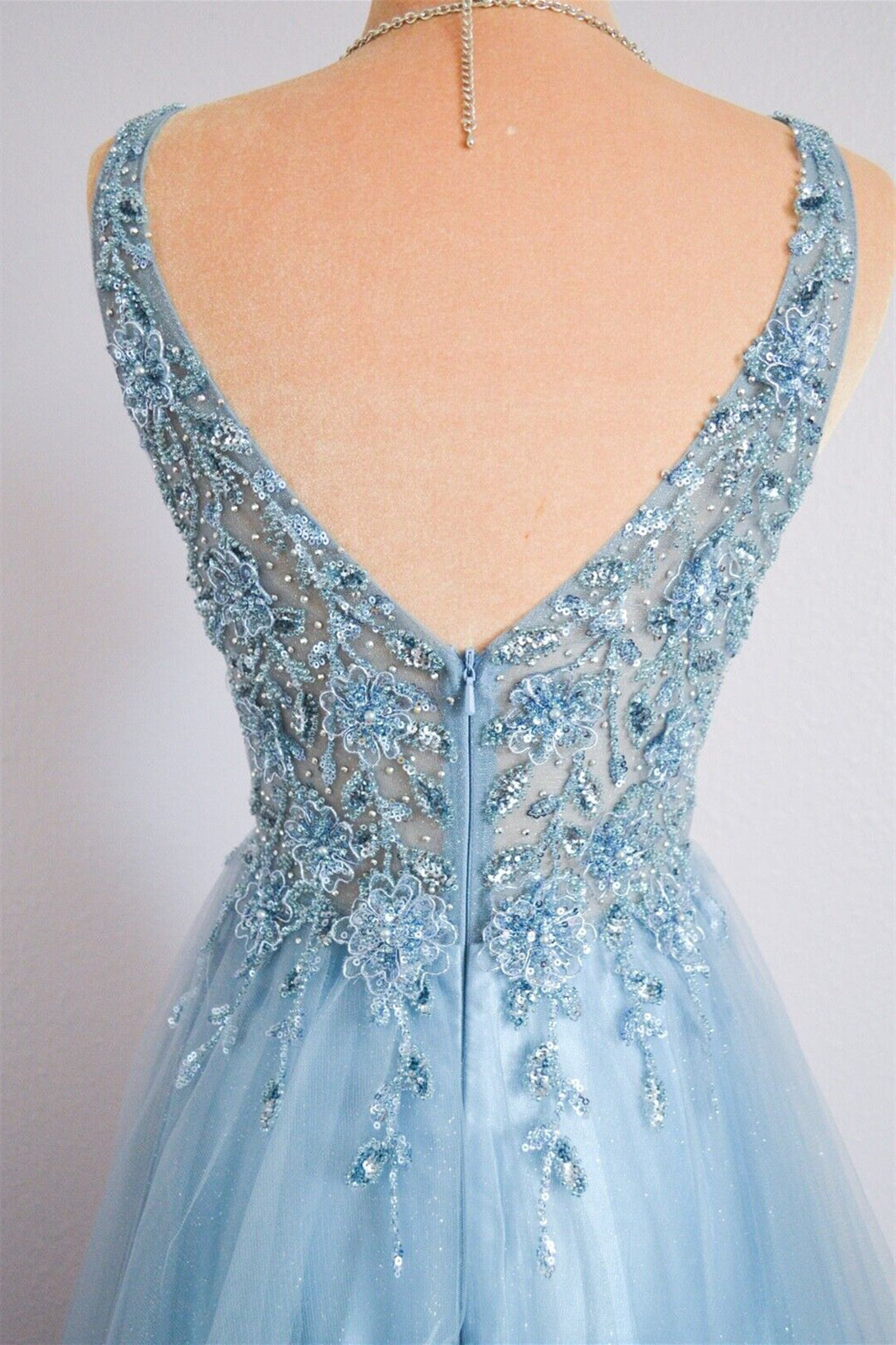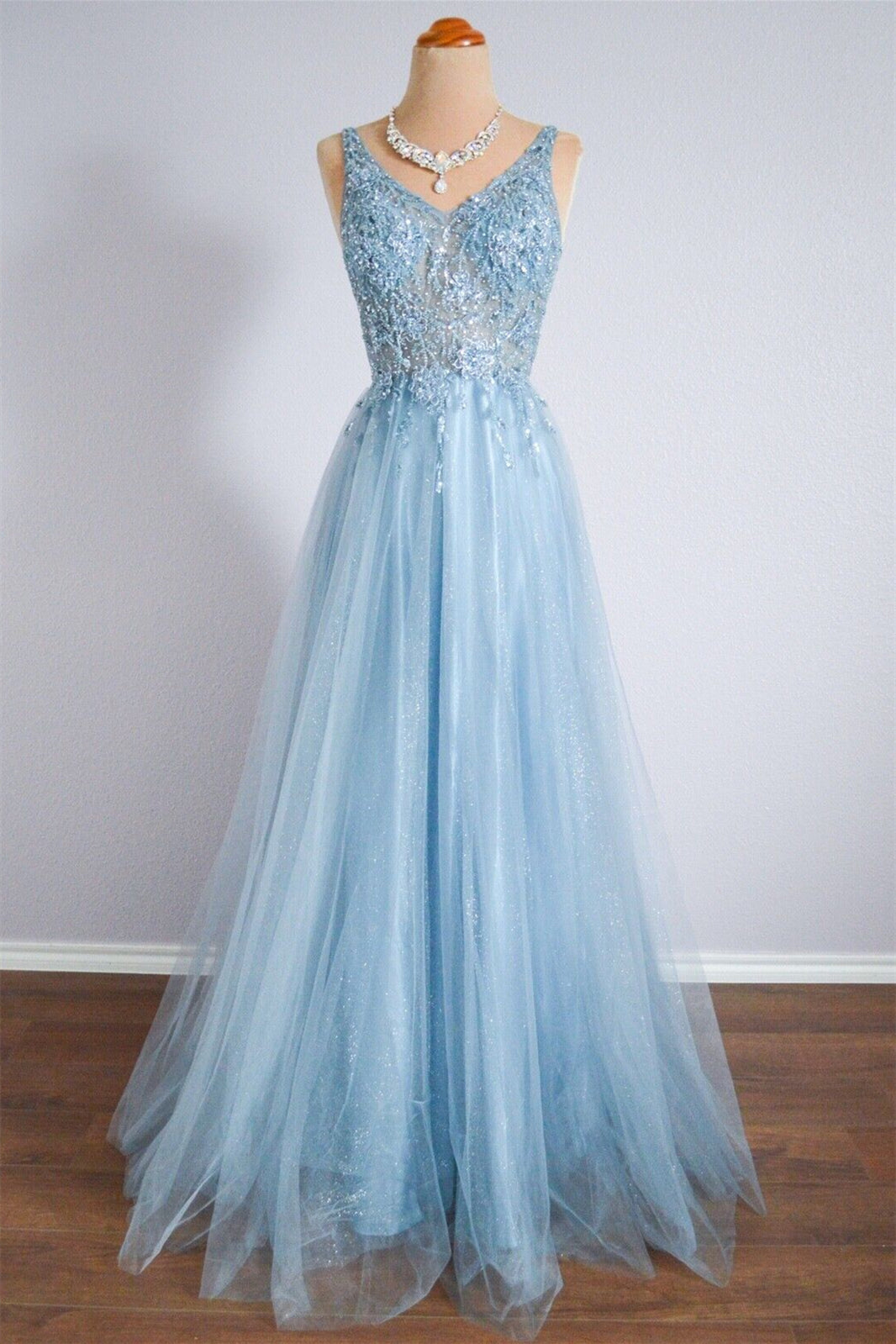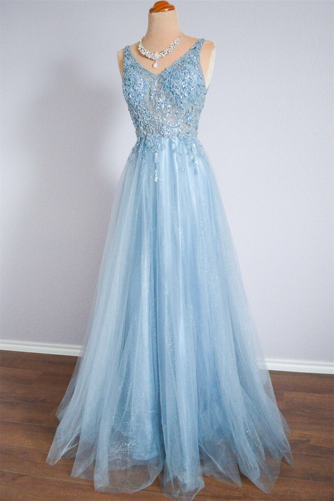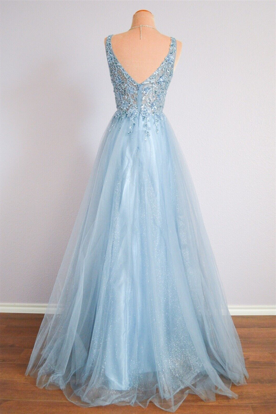 Tulle A-Line Lace Appliques V-Neck Long Party Prom Dress