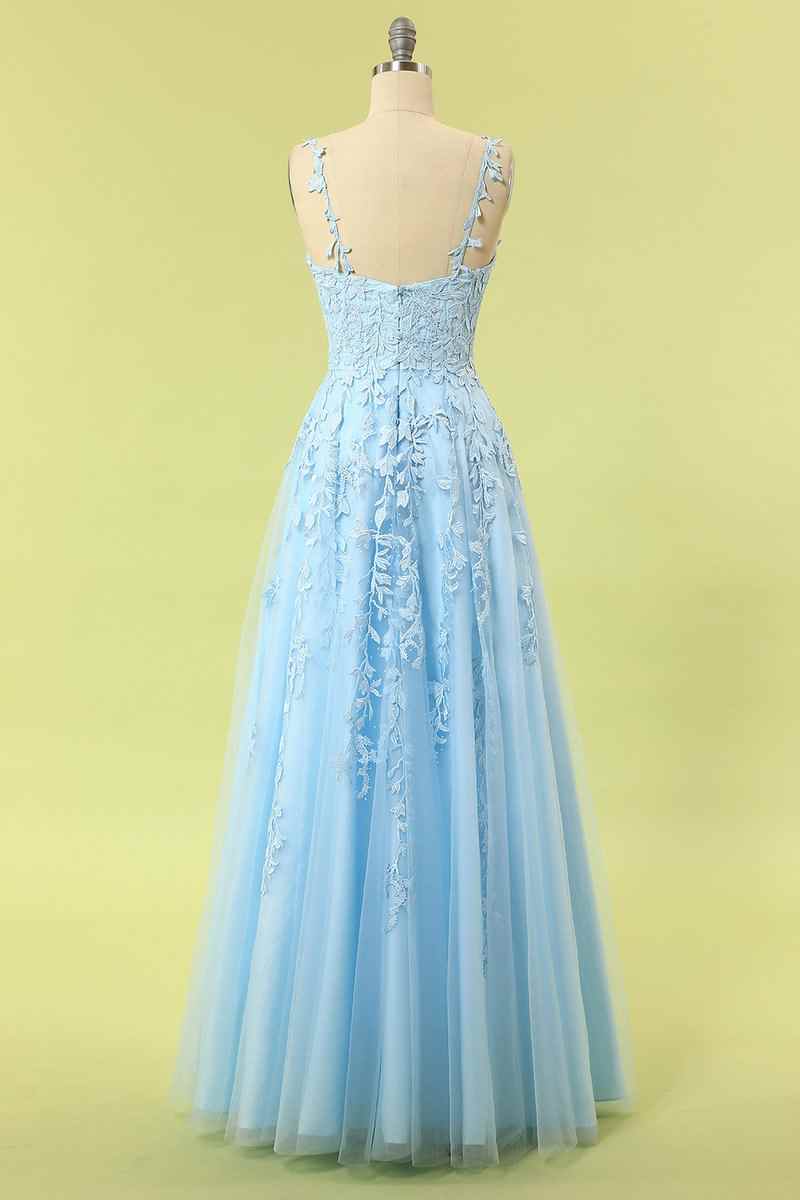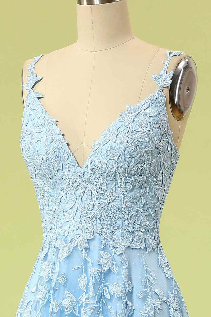 Spaghetti Straps V-Neck Lace Appliques Prom Party Dress