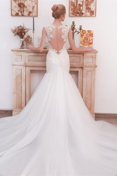 Joyofdress 100% handmade mermaid white lace wedding dress see through back and train in the back.