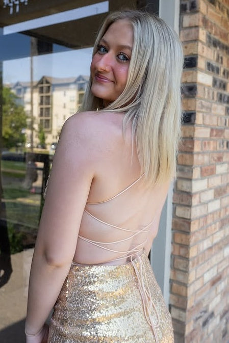This Sparkly Bodycon Mini Dress features a flattering V-neckline and a lace-up back for an adjustable, secure fit. Its shimmering fabric adds a touch of glamour, while the bodycon silhouette accentuates your figure, making it an ideal choice for a standout look at your homecoming event.