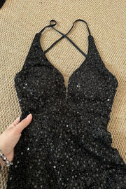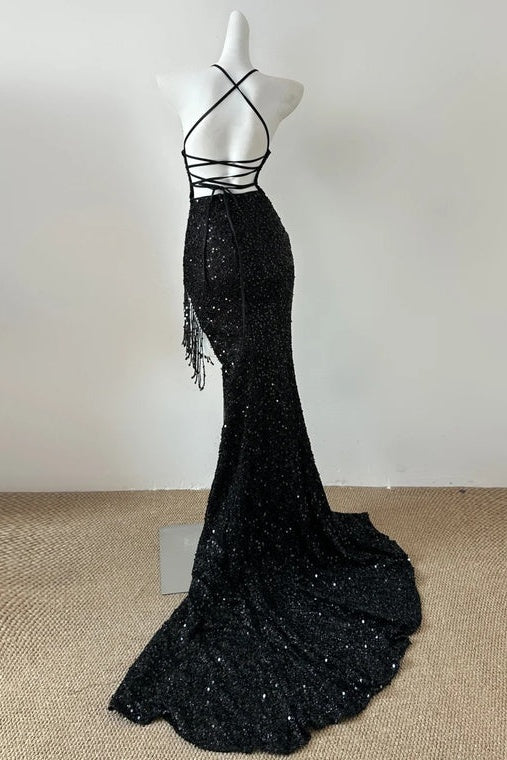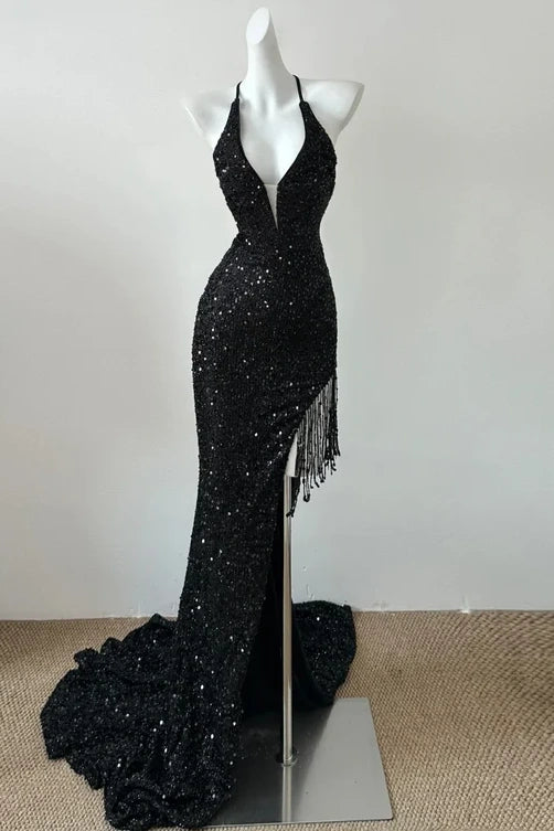 Sparkly V-Neck Sleeveless Sequins Party Prom Dress With Tassels