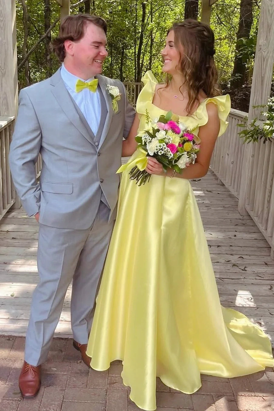 Square Ruffle Straps Satin A-Line Party Prom Dress With Train