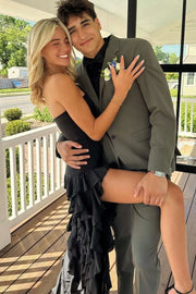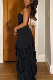 Strapless Empire Satin A-Line Ruffled Party Prom Dress With High Slit