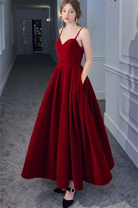 Straps Wine Red Velvet Long Formal Dress with Pockets