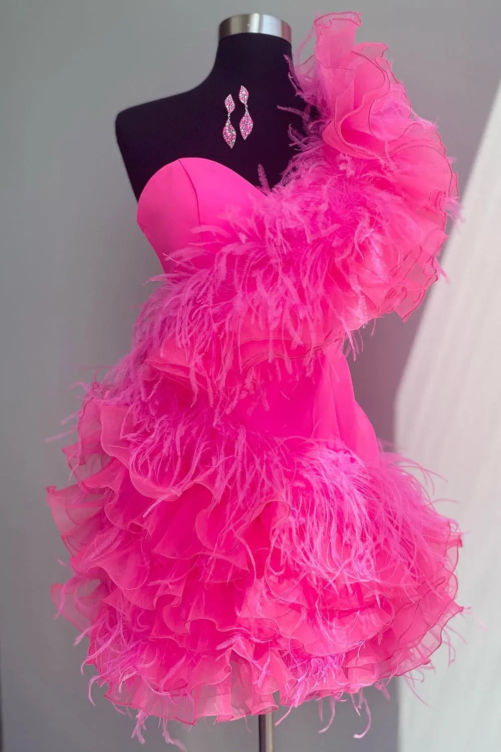 Sweetheart One Shoulder Feathers Ruffled Short Homecoming Dress