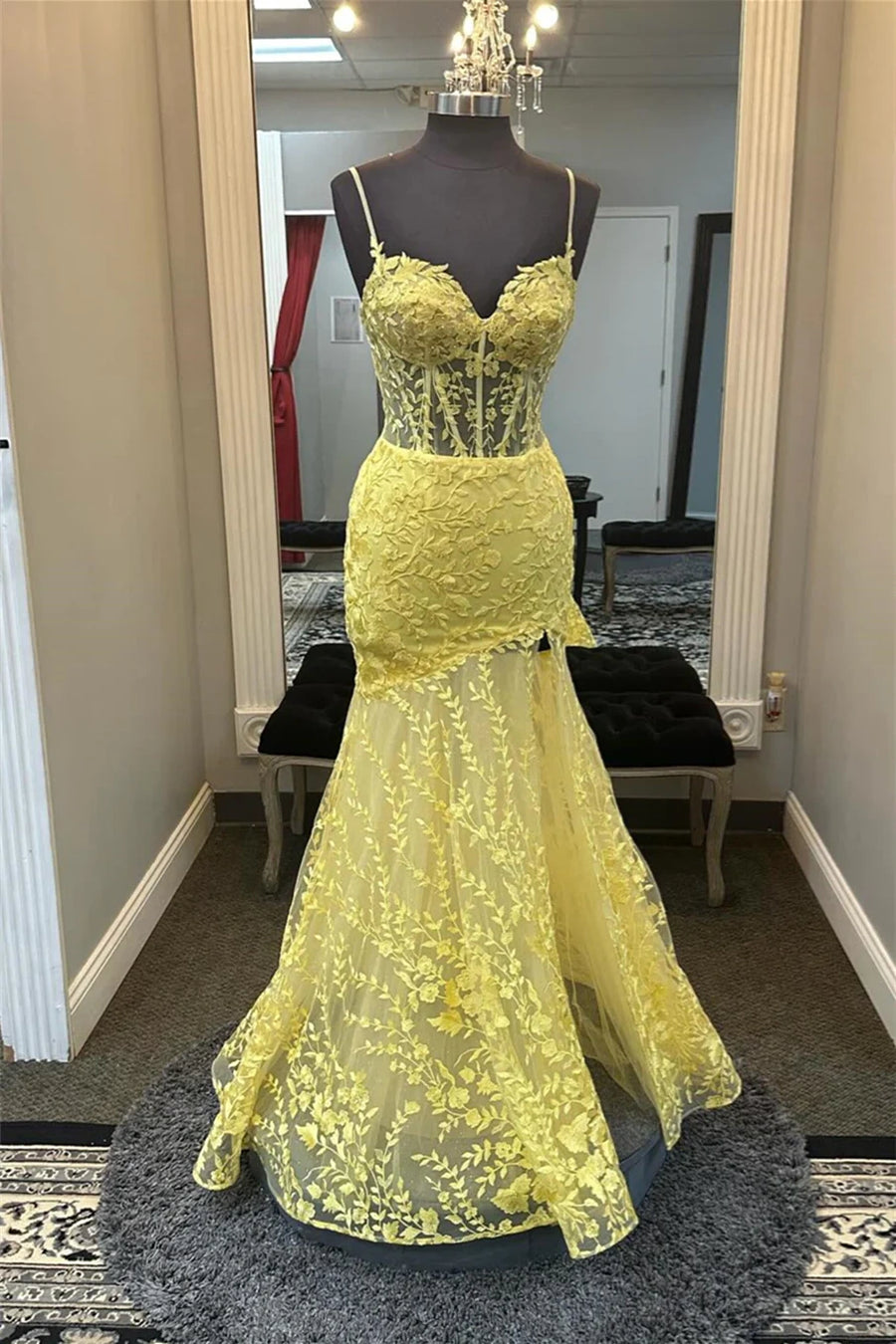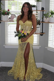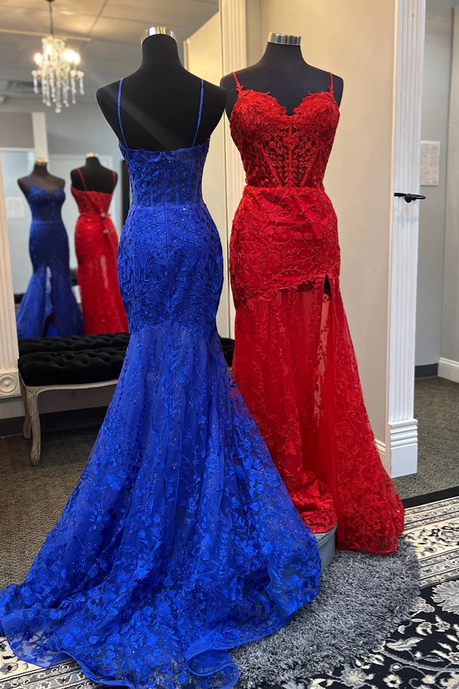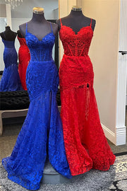 Sweetheart Spaghetti Straps Mermaid Lace Party Prom Dress With Slit