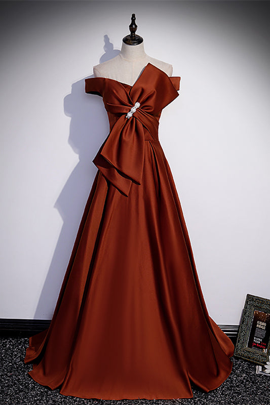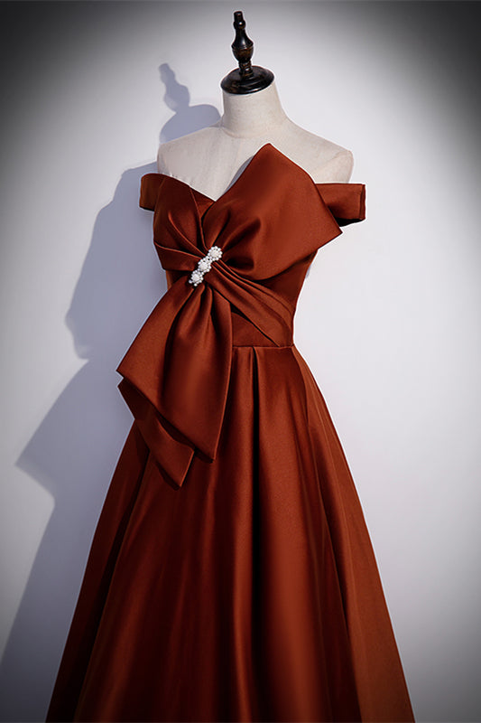 Elevate your prom night with this sophisticated satin A-line dress that seamlessly blends casual elegance with formal allure. The off-shoulder neckline creates a graceful, romantic silhouette, while the empire waistline provides flattering support and comfortable movement. A delicate bow accent adds a refined finishing touch to this timeless design. Crafted from luxurious satin fabric, this dress drapes beautifully and catches light with subtle sophistication. Perfect for those seeking a dress that balances understated charm with undeniable style, this piece transitions effortlessly from prom to special occasions.