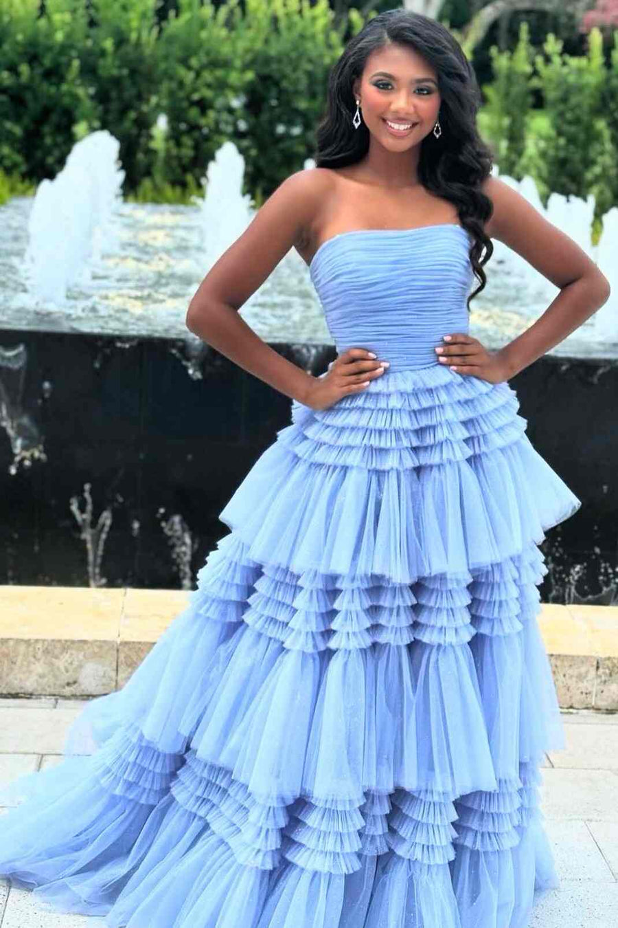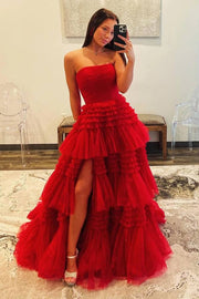 Tulle A-Line Strapless Tiered Prom Gown With Slit