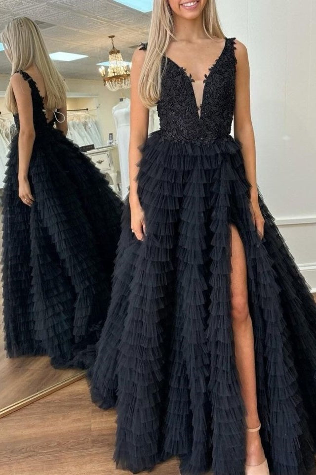 Tulle A-Line V-Neck Backless Appliques Tiered Party Prom Dress