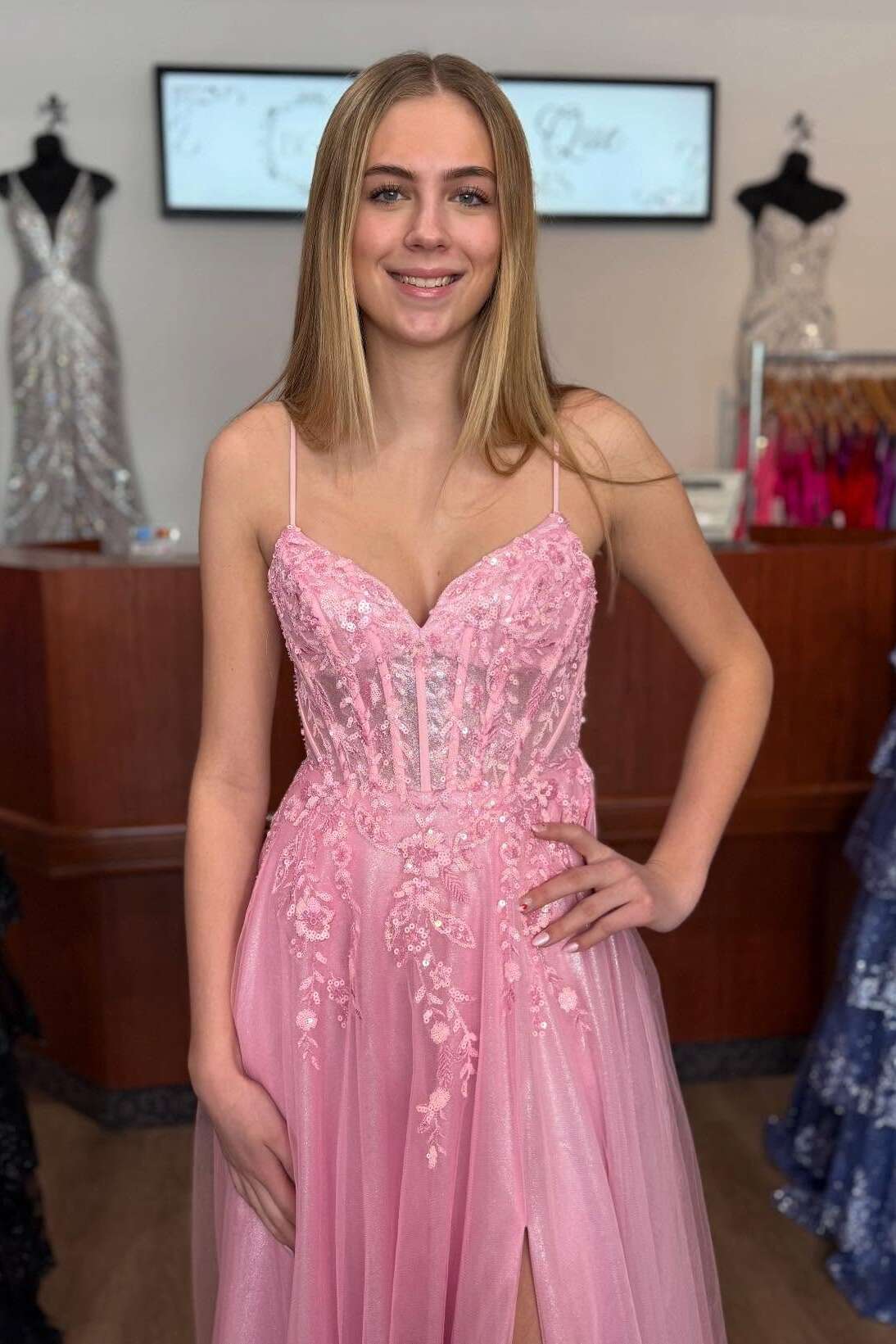 This Tulle A-Line Party Prom Dress showcases a sweetheart neckline complemented by delicate lace appliqués that enhance its romantic appeal. The lightweight tulle skirt flows gracefully, offering both elegance and comfort. Perfect for making a refined statement at any formal...