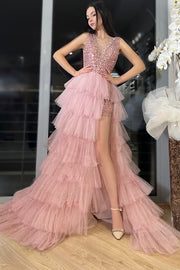 Two Piece V-Neck Backless Sparkly Party Prom Dress With Tulle Train