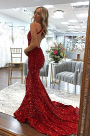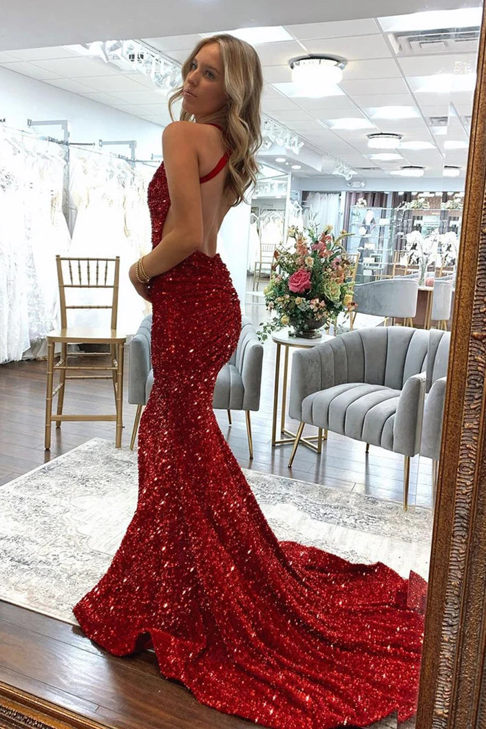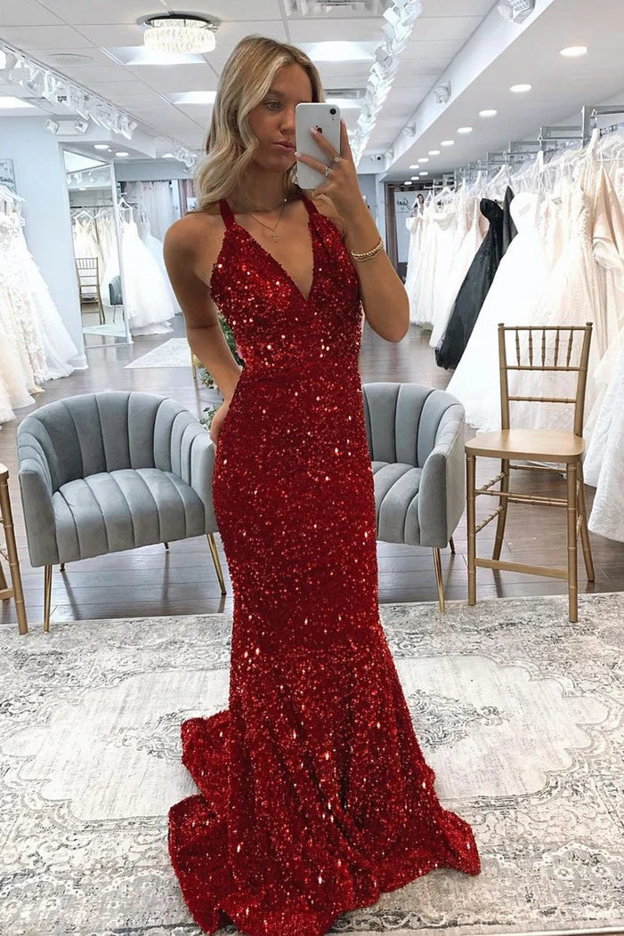 V-Neck Backless Mermaid Sequins Long Party Prom Dress
