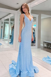 V-Neck Backless Sleeveless Mermaid Pearls Party Prom Dress