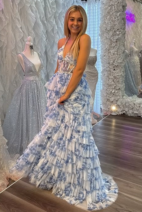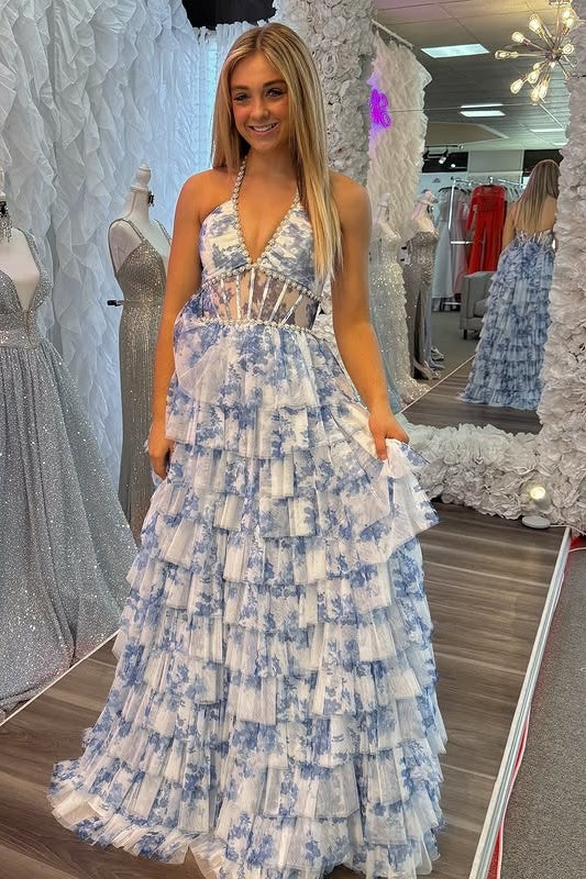V-Neck Halter Backless Tulle A-Line Tiered Party Prom Dress
