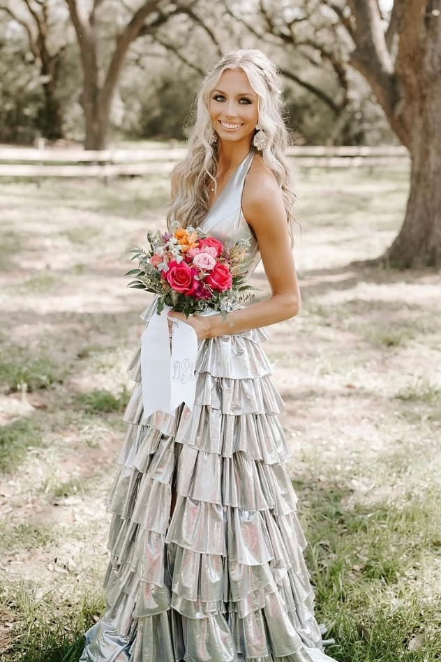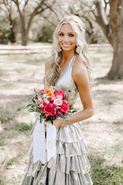 V-Neck Halter Empire Satin A-Line Tiered Party Prom Dress