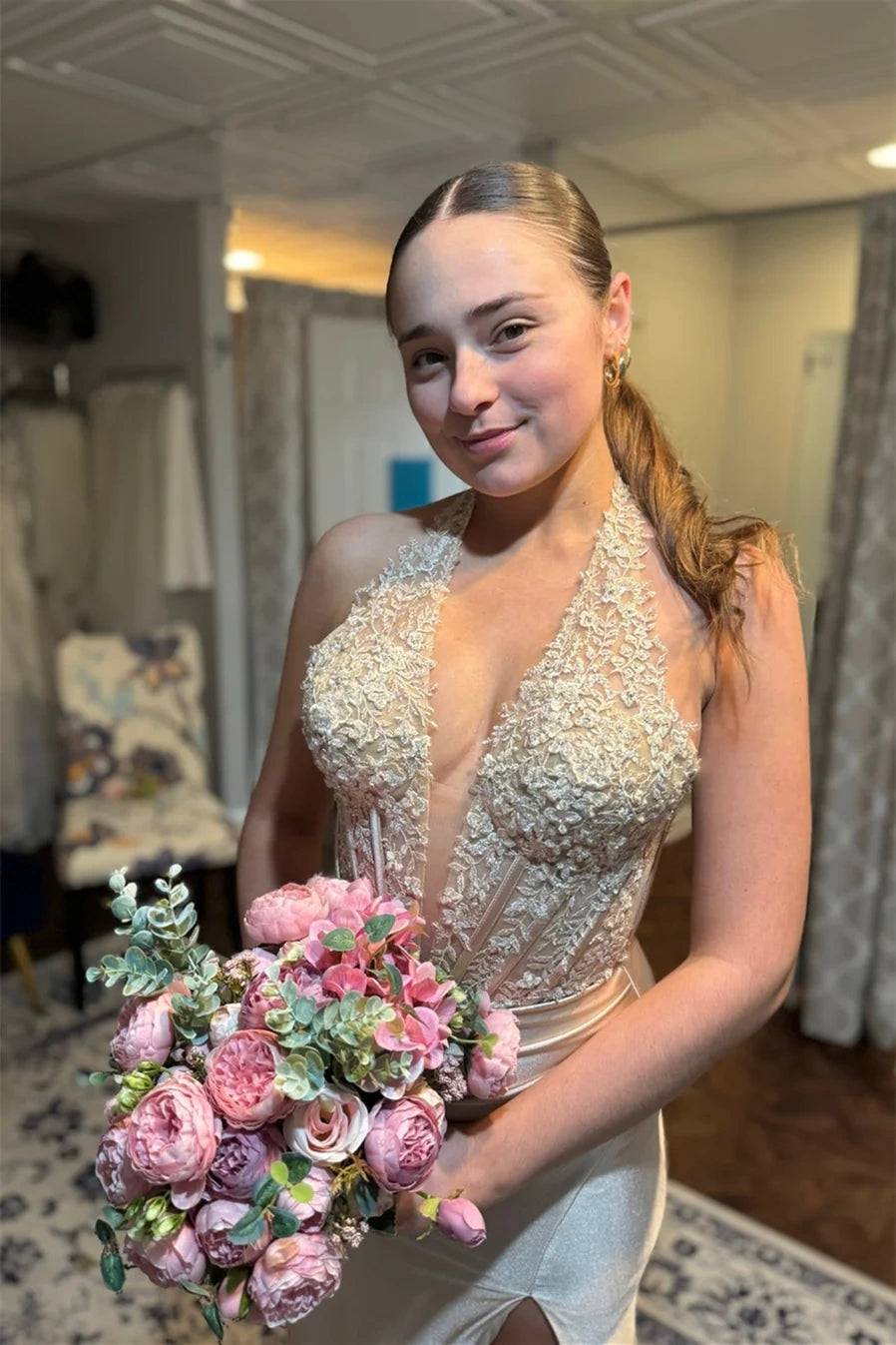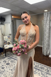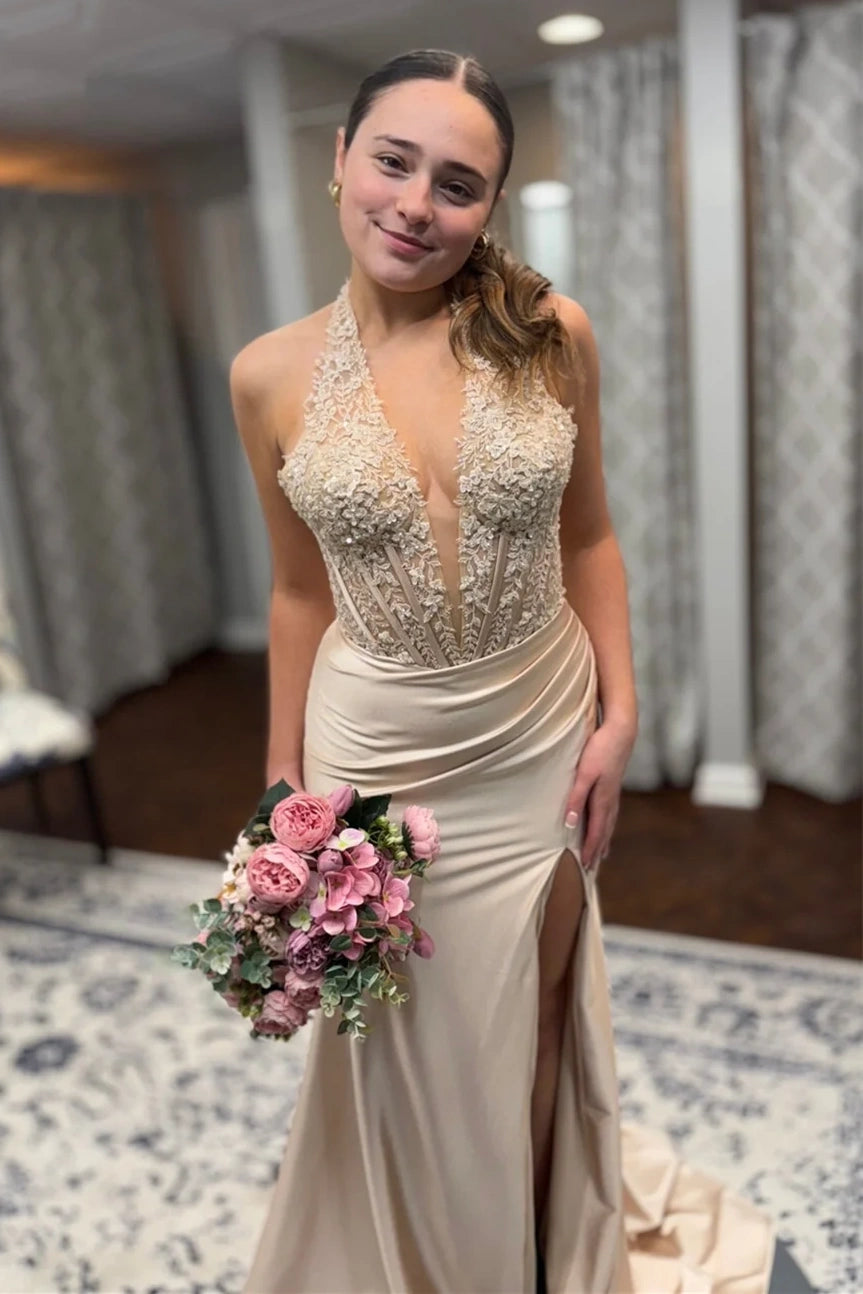 V-Neck Halter Lace Appliques Mermaid Party Prom Dress With Slit