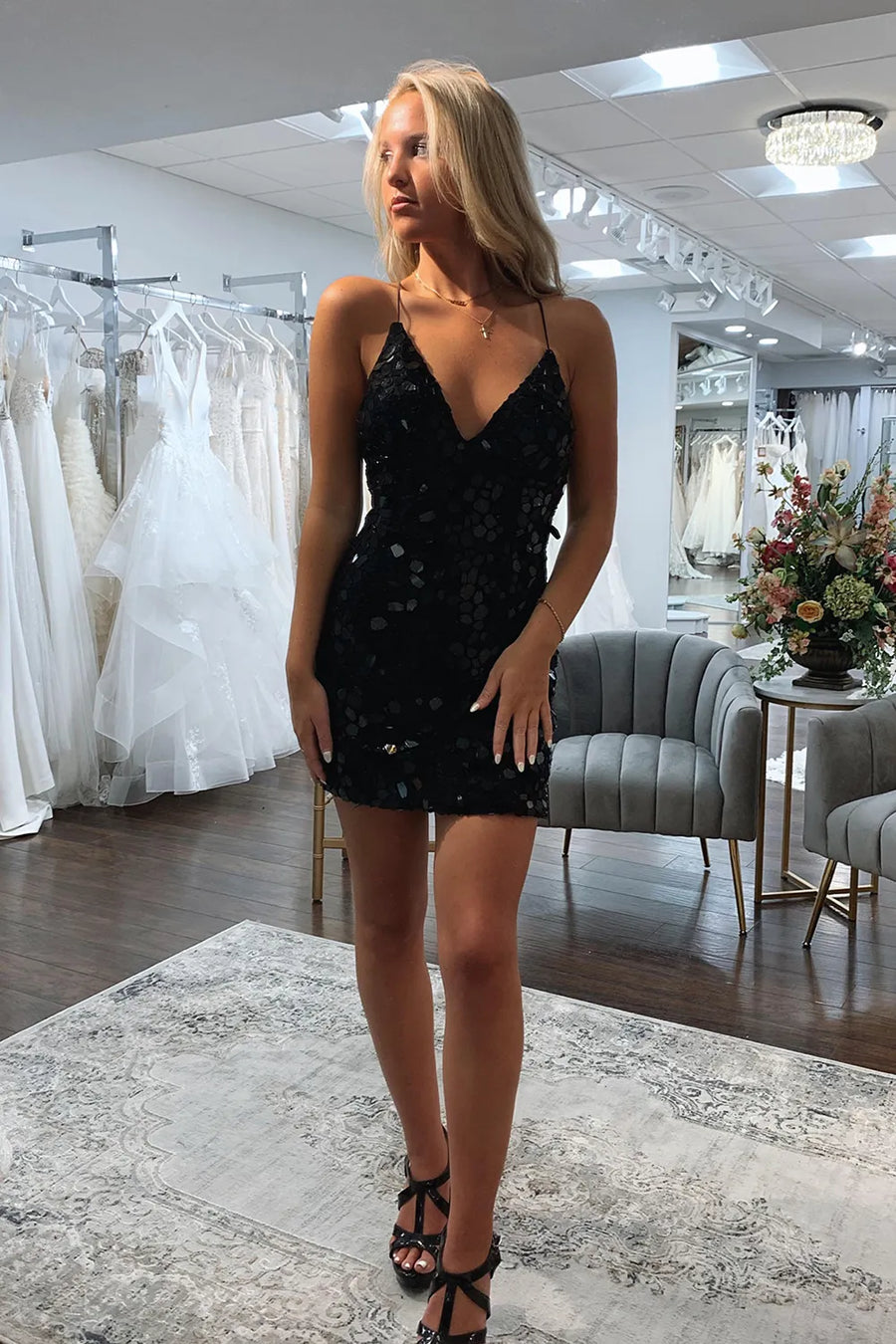 This V-Neck Lace Up Bodycon Sparkly Short Homecoming Dress is the perfect statement piece for any special occasion. Its bodycon fit accentuates your curves, while the lace-up detail adds a touch of elegance. The sparkly fabric adds a hint of glamour, making you the center of attention. Shine bright in this stunning dress.