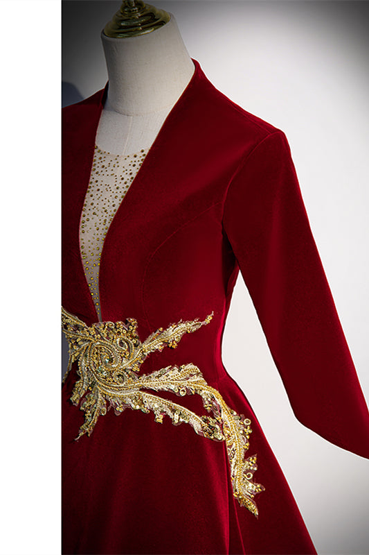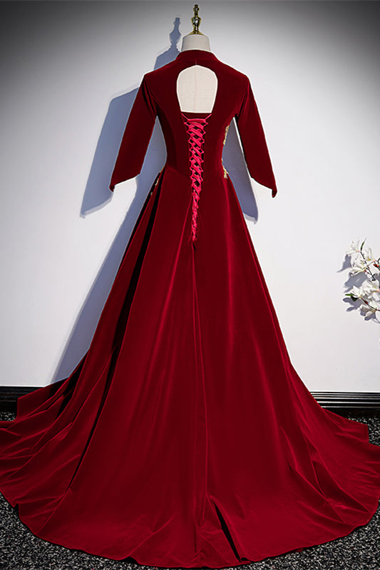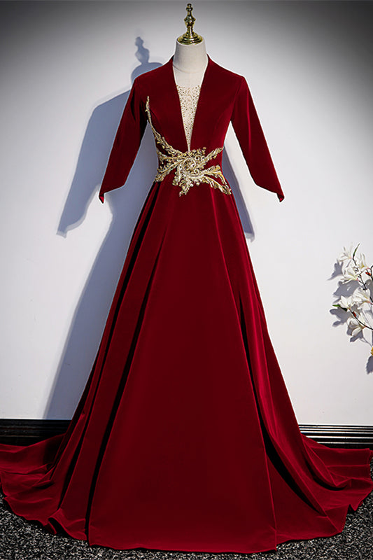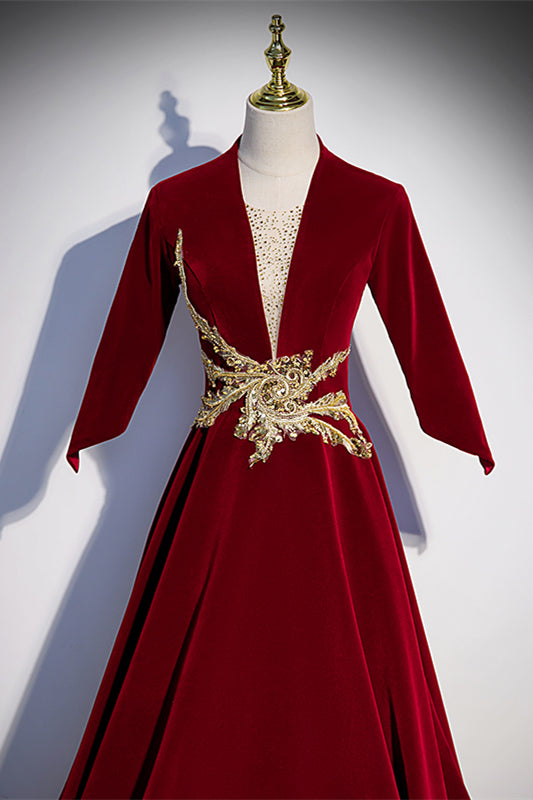Velvet A-Line V-Neck Half Sleeves Appliques Formal Prom Dress