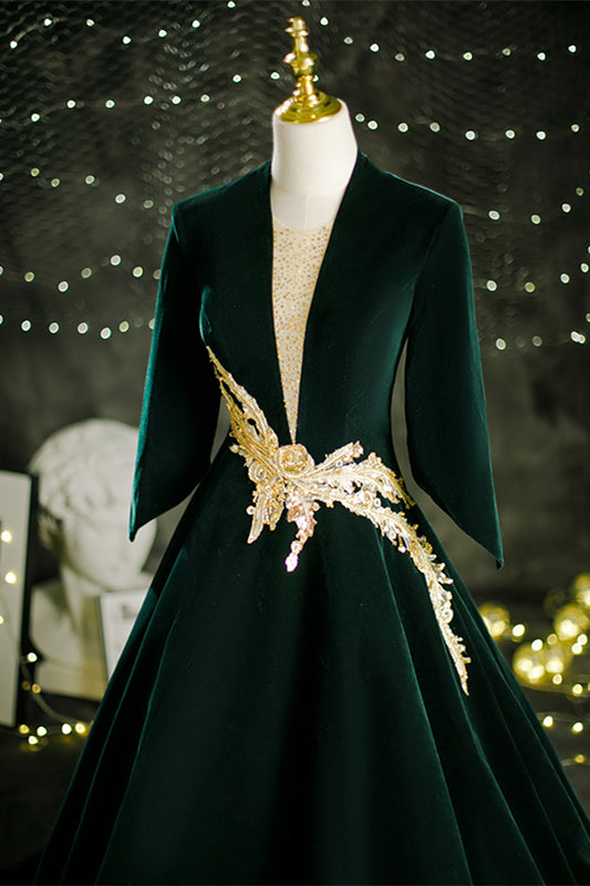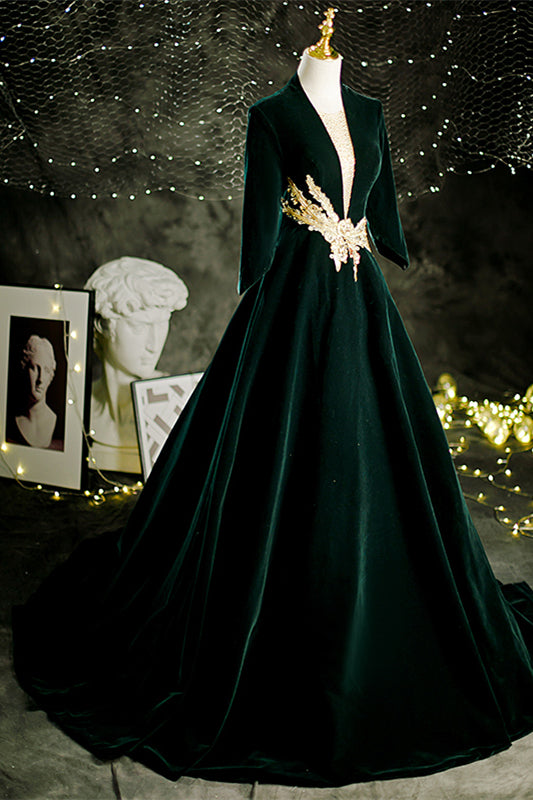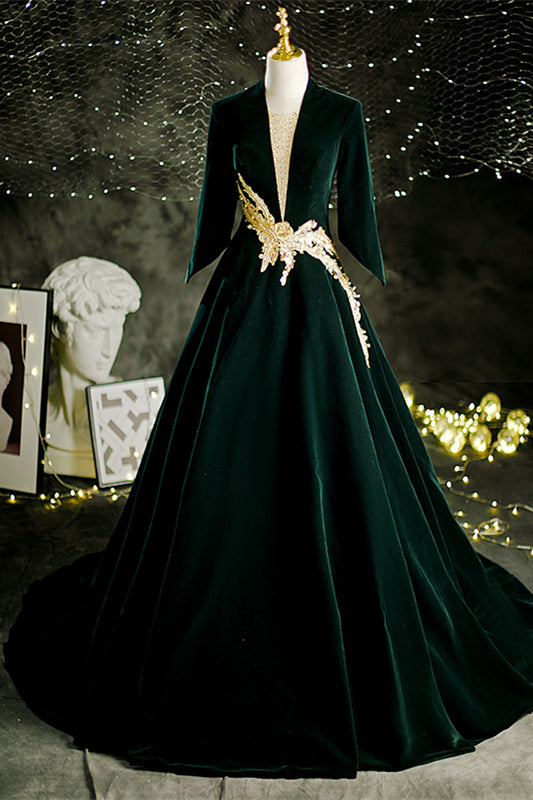 Elevate your formal occasion with this sophisticated velvet A-line prom dress. The flattering V-neckline and half-sleeve design offer timeless elegance, while delicate appliqués add refined detail and visual interest. The A-line silhouette provides graceful movement and complements various body types beautifully. Crafted from luxurious velvet fabric, this dress delivers a sumptuous texture that catches light beautifully. Perfect for prom, galas, or black-tie events, this gown combines classic styling with contemporary flair for an unforgettable entrance.