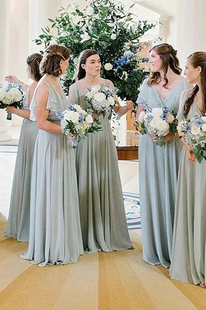 V-Neck Ruffled Sleeves Chiffon A-Line Bridesmaid Dress