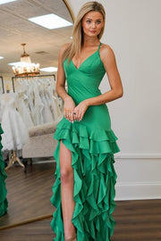 V-Neck Sleeveless Satin A-Line Ruffled Party Prom Dress With Slit