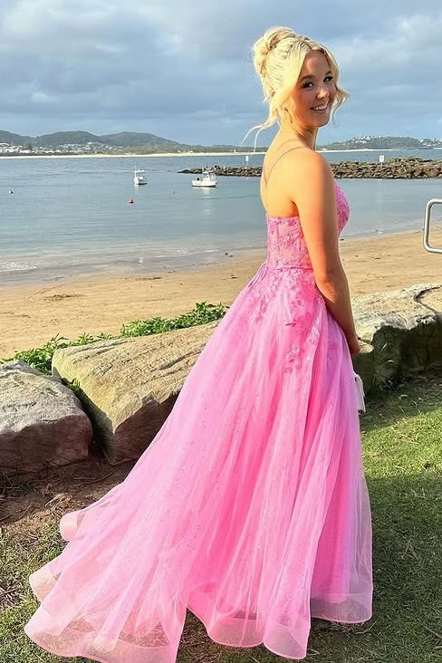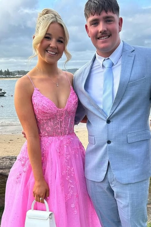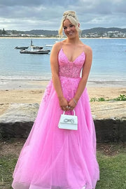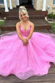 V-Neck Sleeveless Tulle A-Line Lace Appliques Party Prom Dress