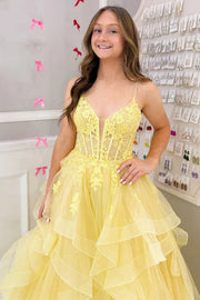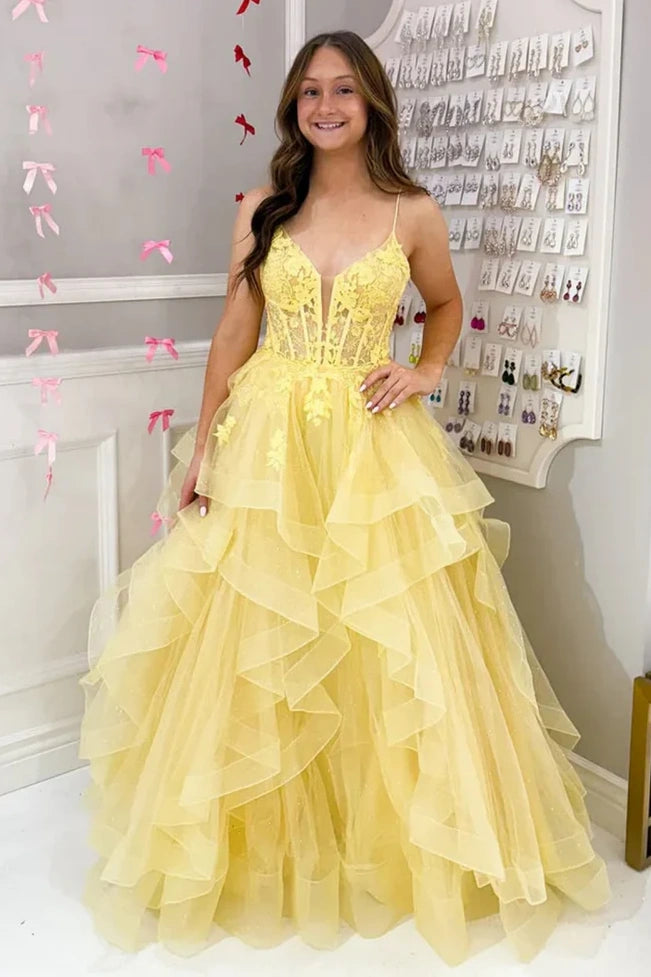 V-Neck Sleeveless Tulle A-Line Tiered Appliques Prom Dress