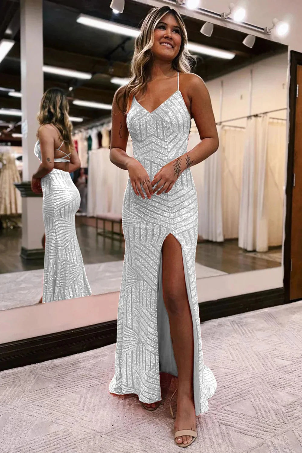 Step into the spotlight with our elegant V-Neck Spaghetti Straps Mermaid Sequins Party Prom Dress. The flattering V-neckline and slim spaghetti straps accentuate your figure, while the mermaid silhouette adds a touch of glamour. Perfect for any special occasion, this...