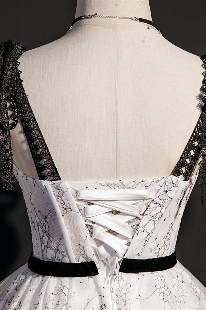 Joyofdress this white flower print bow tie shoulder homecoming dress; featuring lace straps with bow tie design on the shoulder, a bow sash with a silver adornment detail, and a corset bodice with short-length skirt. The delicate look is completed with the intricate flower prints. The perfect dress for any special occasion.