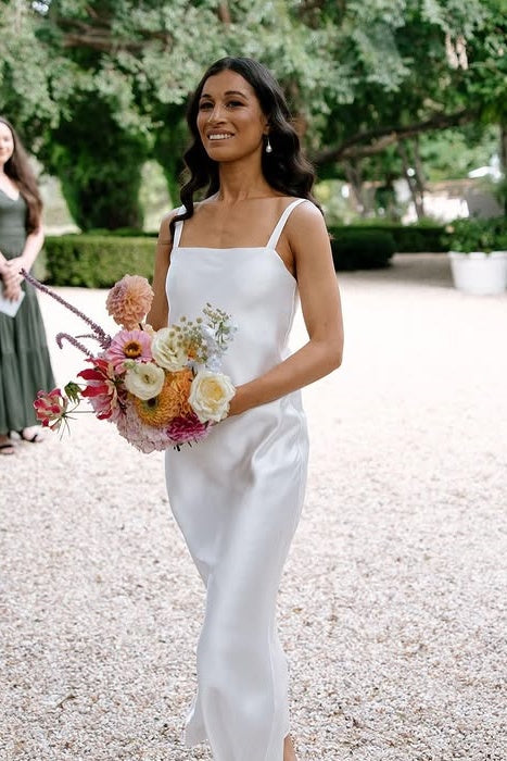 Crafted with elegant white fabric, this Mermaid Bridesmaid Dress features square spaghetti straps that delicately frame the shoulders and a flattering mermaid silhouette. Perfect for any bridal party, this dress exudes sophistication and style. Elevate your bridesmaids' look with this stunning dress.
