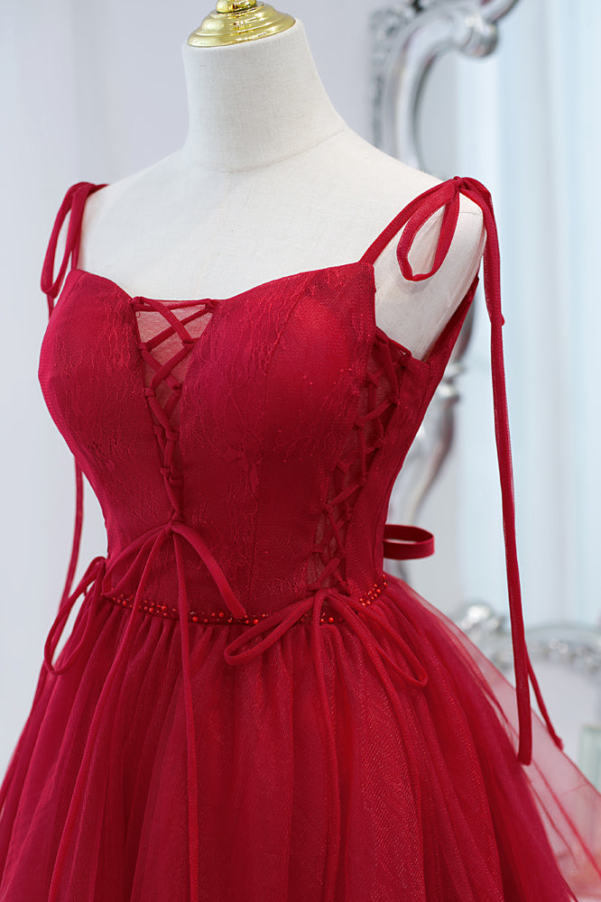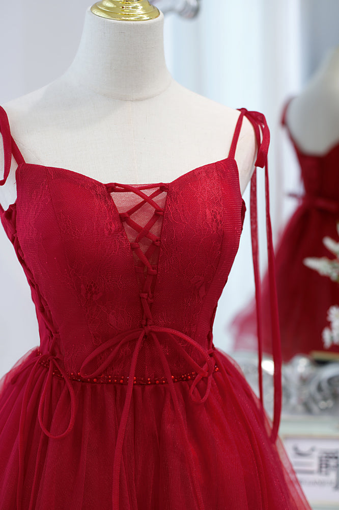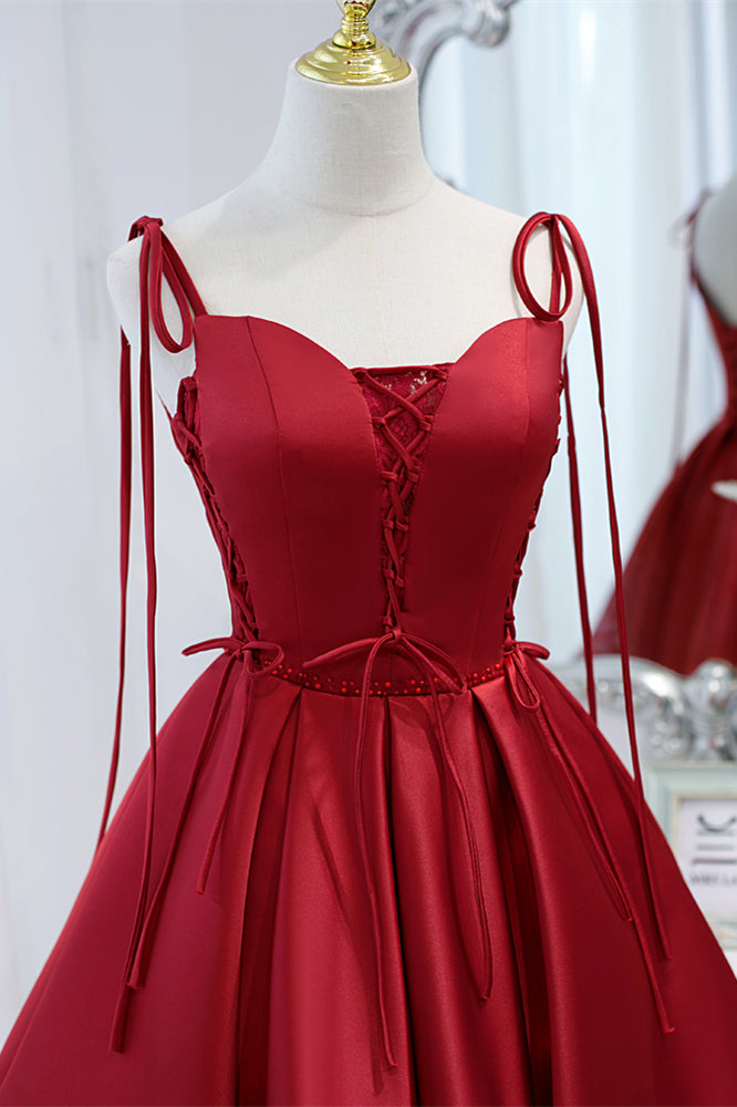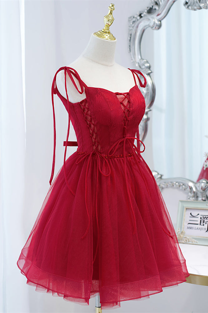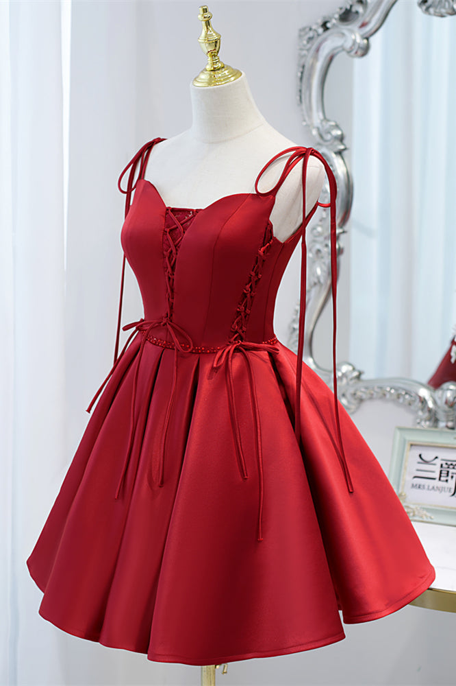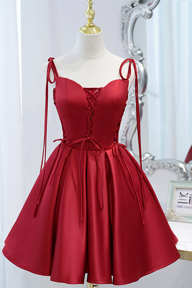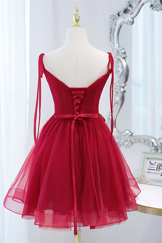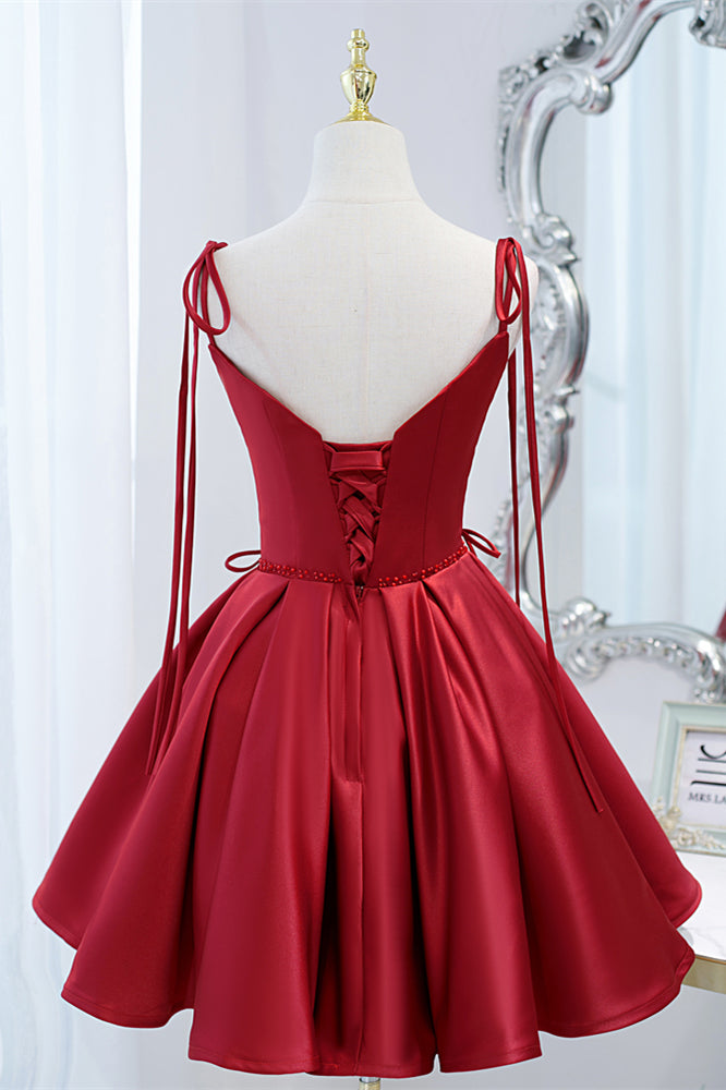 Wine Red Bow Tie Lace-Up Deep V Beaded Homecoming Dress