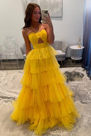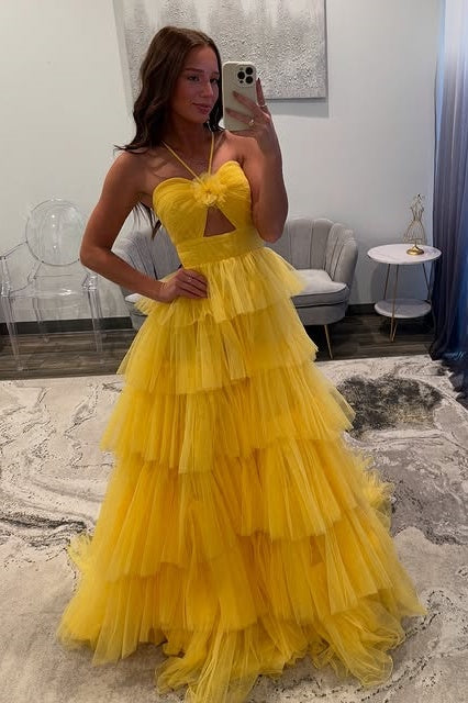 Yellow Tulle A-Line Halter Tiered Long Party Prom Dress