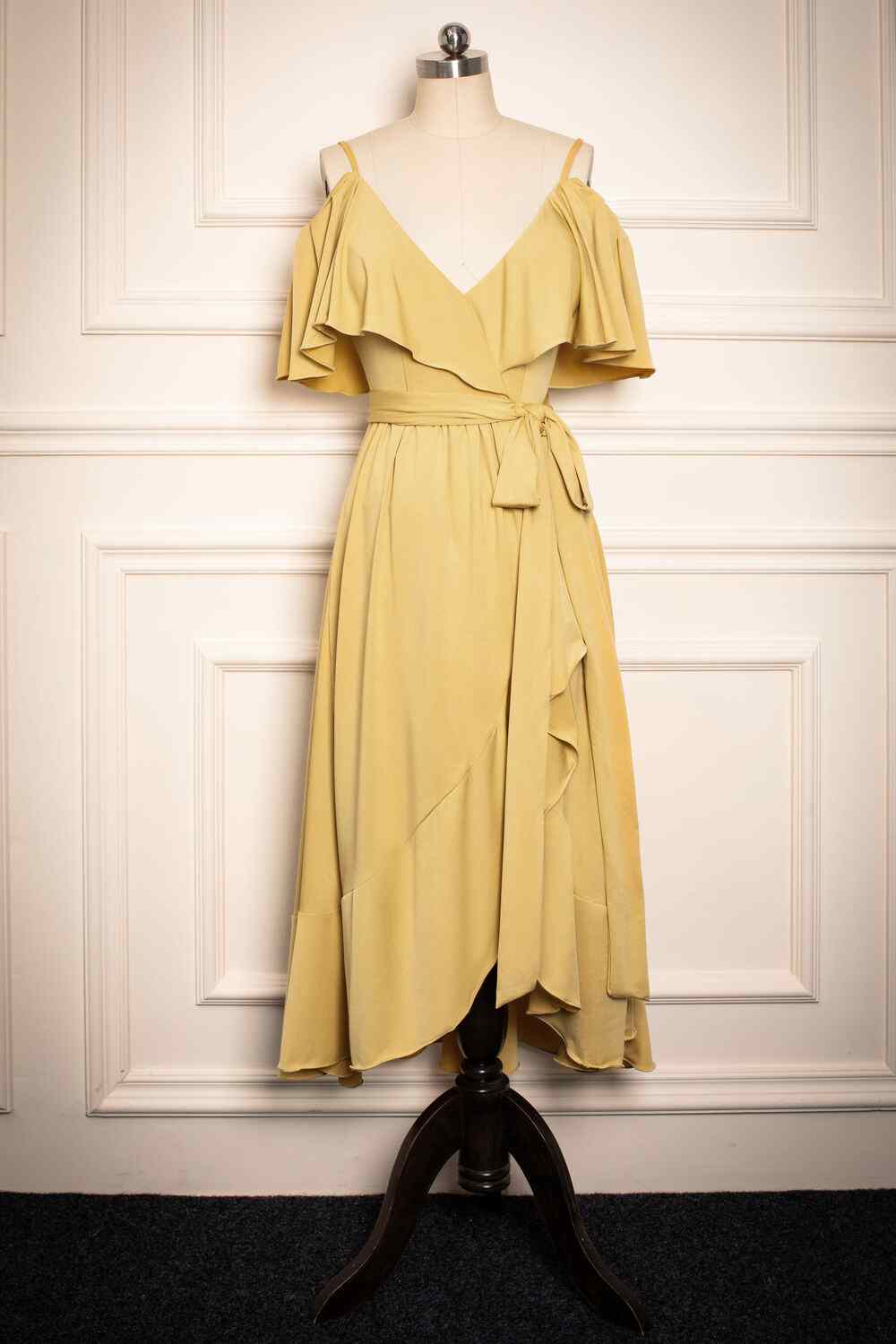 Yellow V Neck Flaunt Sleeves Faux-Wrap Chiffon Knee Length Bridesmaid Dress
