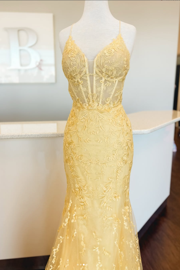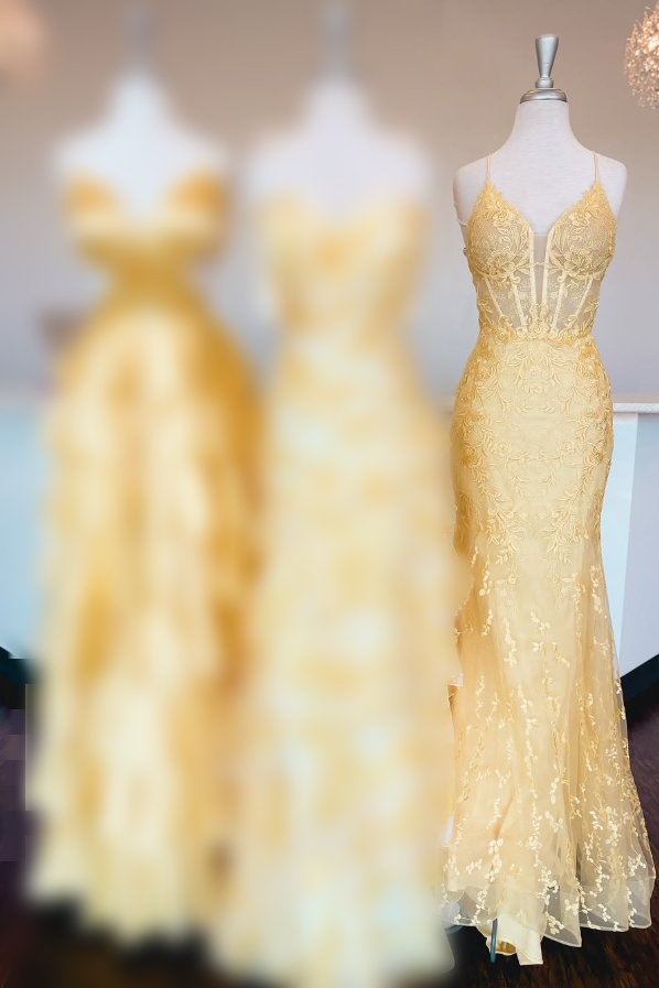 Yellow V-Neck Sleeveless Mermaid Lace Appliques Party Prom Dress